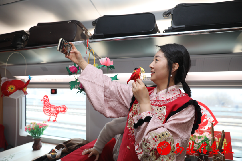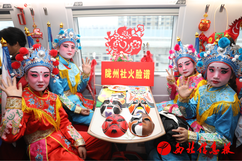 “从慢火车到高铁,变的是速度,不变的是对文化传承的坚守。”汪洋说,为让陇州非遗在高铁上完美呈现,团队提前策划、精心布置,从车厢装饰到节目筛选,每个细节都反复打磨。2月27日,非遗活动率先在6074/1次慢火车上上演,一脉相承的民俗魅力为高铁首秀预热;2月28日,这场文化盛宴登上西延高铁,让来自五湖四海的旅客,在飞驰的列车上邂逅关中民俗的独特韵味。