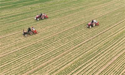 山东省聊城市茌平区博平镇刘古村田间,农机手们驾驶着拖拉机给小麦进行施肥作业。