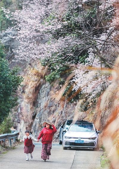 近日,浙江省建德市三都镇数万亩野生樱花进入盛花期,三都镇推出系列主题活动,带动当地民宿、农家乐消费升温。图为游客在观赏野樱花。