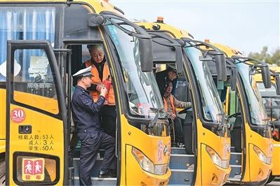 在江西省赣州市章贡区厚德外国语学校停车场,交警对校车安全性能进行安全检查,迎接学生开学。