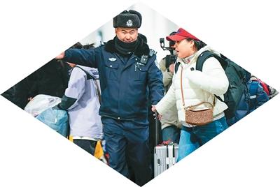 新疆维吾尔自治区乌鲁木齐铁路公安局奎屯公安处民警正在引导春运返程旅客。