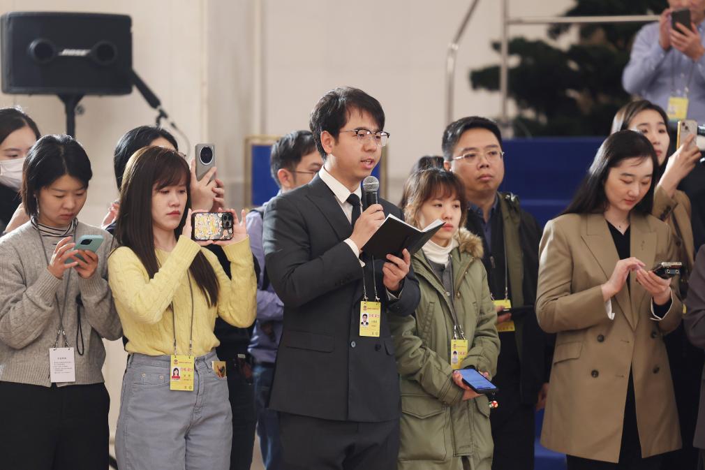 3月4日,全国政协十四届四次会议首场“委员通道”集体采访活动在北京人民大会堂举行。这是记者在提问。