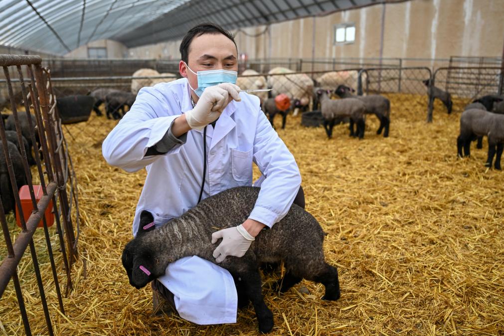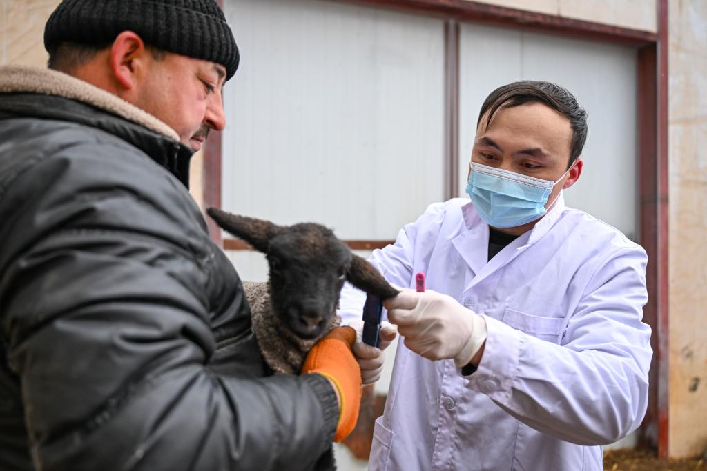 在位于新疆昌吉回族自治州的日发新西域玛纳斯牧业有限公司,工作人员为羊羔测体温(3月3日摄)。新华社记者 丁磊 摄
