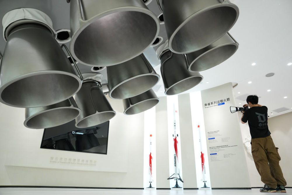 一名记者在北京经济技术开发区蓝箭航天空间科技股份有限公司拍摄朱雀系列运载火箭的模型(2025年6月18日摄)。新华社记者 郑焕松 摄