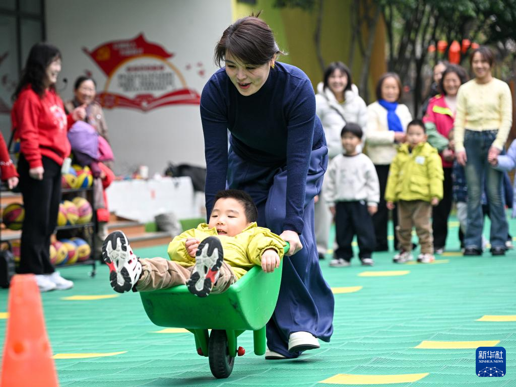 3月6日,在江苏南京建邺区金地名京幼儿园举行的迎“三八”活动上,小朋友和妈妈一起参加亲子游戏。