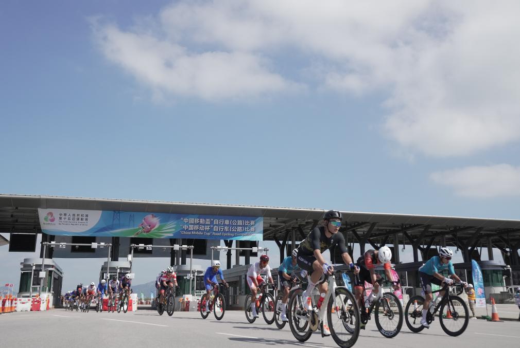 2025年11月8日,第十五届全国运动会公路自行车男子个人赛选手经过港珠澳大桥香港口岸车辆通关广场。新华社发(吕小炜 摄)