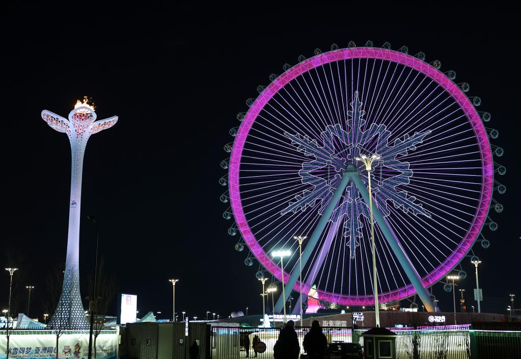 2025年2月14日,第九届亚洲冬季运动会闭幕式在哈尔滨举行。这是当天在哈尔滨冰雪大世界拍摄的亚冬会主火炬和摩天轮。新华社记者 黄伟 摄