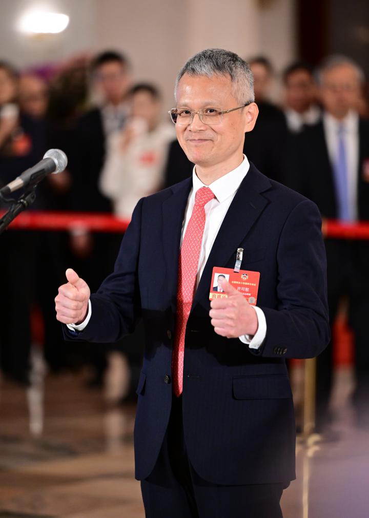 3月11日,全国政协十四届四次会议第三场“委员通道”集体采访活动在北京人民大会堂举行。这是全国政协委员徐坤接受媒体采访。