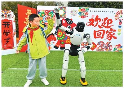 近日,湖南省长沙市开福区新竹第二小学以“AI科技+教育”的方式迎来春季开学,智能机器人走进校园,与学生面对面互动。