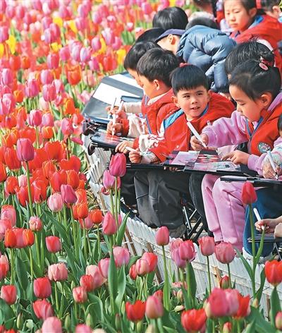 近日,安徽省芜湖市鸠江区神山公园春意盎然,郁金香竞相绽放。顶峰幼儿园的孩子们围坐在盛放的郁金香花田旁,手持画笔描绘春日美景。
