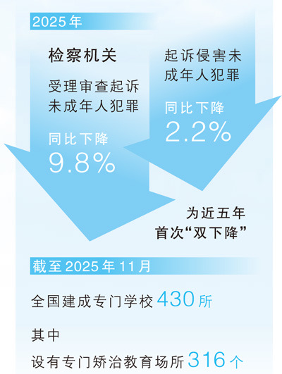 全国两会上,《最高人民法院工作报告》提出,综合施治做好教育、感化、挽救工作,未成年人犯罪高发势头得到有效遏制。《最高人民检察院工作报告》的数据显示,2025年,检察机关起诉侵害未成年人犯罪和受理审查起诉未成年人犯罪同比分别下降2.2%和9.8%,为近5年来首次“双下降”。