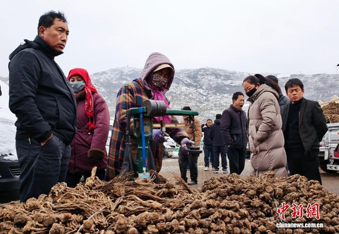 3月17日,位于甘肃定西市岷县的中国当归城内,药商称量中药材。中新社记者 闫姣 摄