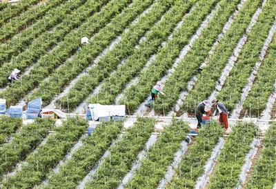 在海南省三亚市天涯区桶井村稻菜轮作基地,村民正在田间采摘辣椒。