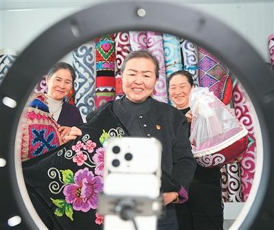 3月11日,在新疆维吾尔自治区沙湾市博尔通古乡阔克加依达克社区的海霞刺绣合作社里,合作社成员正在通过网络直播销售哈萨克族刺绣手工艺品。