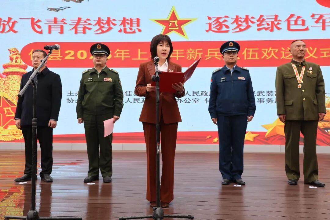 本报讯(通讯员 曹姣姣 白宇杰)阳春三月送新兵,戎装启程踏征程。近日,佳县2026年上半年新兵欢送仪式在葭州文化广场举行,为即将奔赴军营、献身国防的新兵壮行。县委常委、县征兵工作领导小组组长、常务副县长苏晓洁,县委常委、县征兵工作领导小组副组长、人武部上校部长张文杰,县退役军人事务局等相关单位负责人及一等功臣许胜利出席仪式。县征兵工作领导小组副组长、人武部上校政治委员贾国连主持仪式。