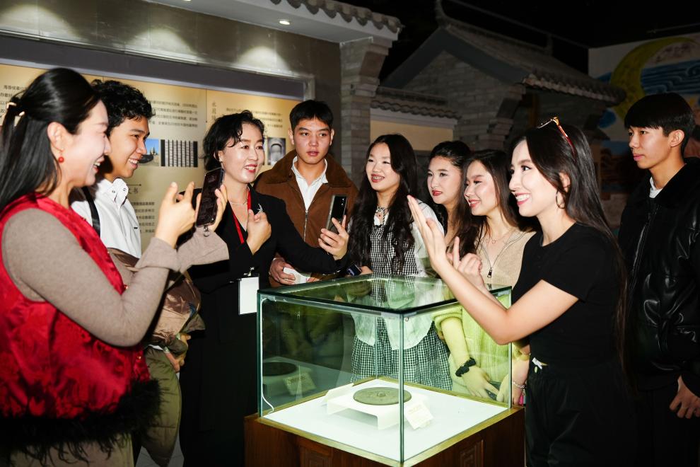 2025年11月28日,在新疆中哈霍尔果斯国际边境合作中心中国文化馆,来自哈萨克斯坦的青年参观中国历史文化展。新华社记者 徐宏岩 摄
