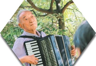 90岁的银发博主王爷爷在公园中为老伴表演手风琴。