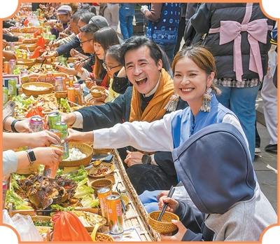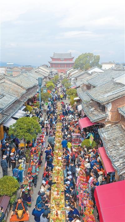 游客在巍山小吃节上品尝长街宴。