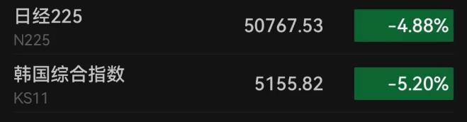 30日,日韩股市开盘后双双大跌。韩国KOSPI指数跌幅扩大至5%,现报5155.82点。日经225指数跌超4%,报50767.53点。日本东证指数跌幅扩大至4.5%。