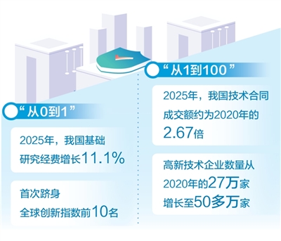 原始创新是科学技术发展的源头活水,没有“从0到1”的这一步,就难以在关键核心技术突破上取得主动权。但如果创新仅停留在实验室层面,也难以为经济社会高质量发展作出实质贡献。科技成果只有通过高效转化走向产业应用,才能释放更大的价值和影响力。2025年,我国基础研究经费增长11.1%,首次跻身全球创新指数前10名,“从0到1”的策源能力强劲;技术合同成交额约为2020年的2.67倍,高新技术企业数量从2020年的27万家增长至50多万家,“从1到100”的产业动力澎湃。