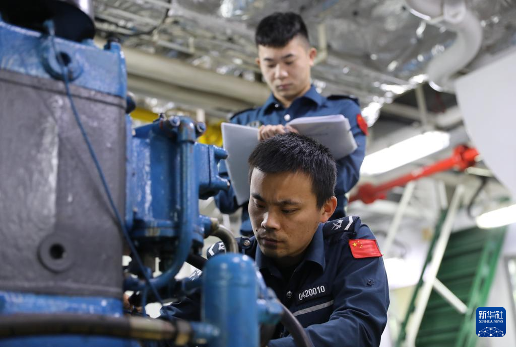 3月12日,中国海警万山舰执法员在机舱检修设备。