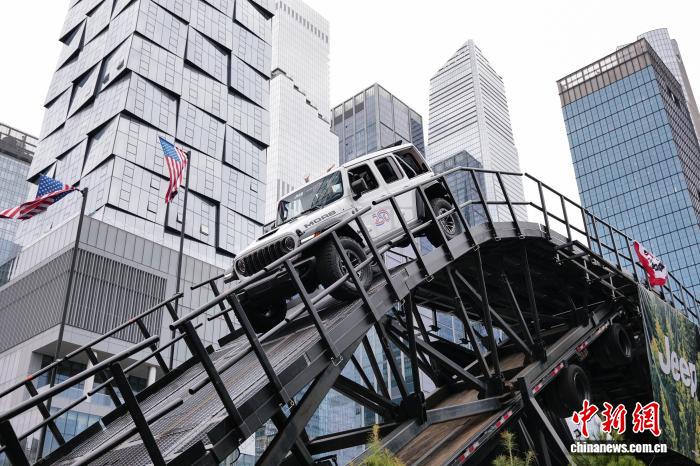 当地时间4月1日,2026年纽约国际车展在美国纽约贾维茨会展中心启幕。图为人们体验吉普汽车的越野性能。 中新社记者 王帆 摄