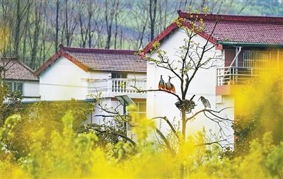 朱鹮在洋县草坝村民居旁的枝头休憩。