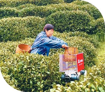 浙江杭州,茶农将采摘的芽叶交给机器狗,送往制茶工坊。