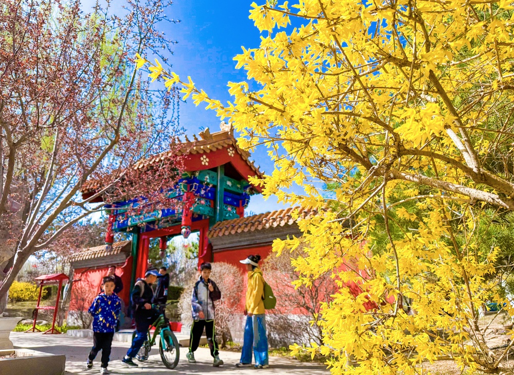 4月5日,清明假期,银川花博园成为踏青赏景的热门之选,市民游客在春和景明中感受自然馈赠的盎然生机。吐翠的新枝与蓝绿相间的水系辉映,令人心旷神怡。记者 马楠 摄