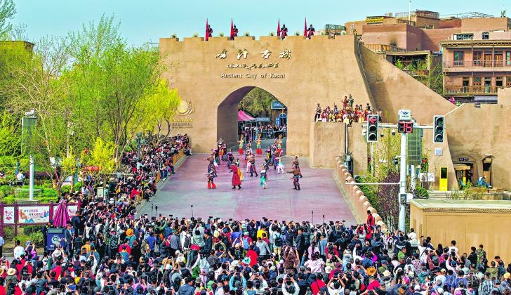 清明假期,喀什古城景区春光正好,前来打卡的游客络绎不绝。图为4月5日,游客在景区观赏开城仪式。□热衣丁·苏莱曼摄