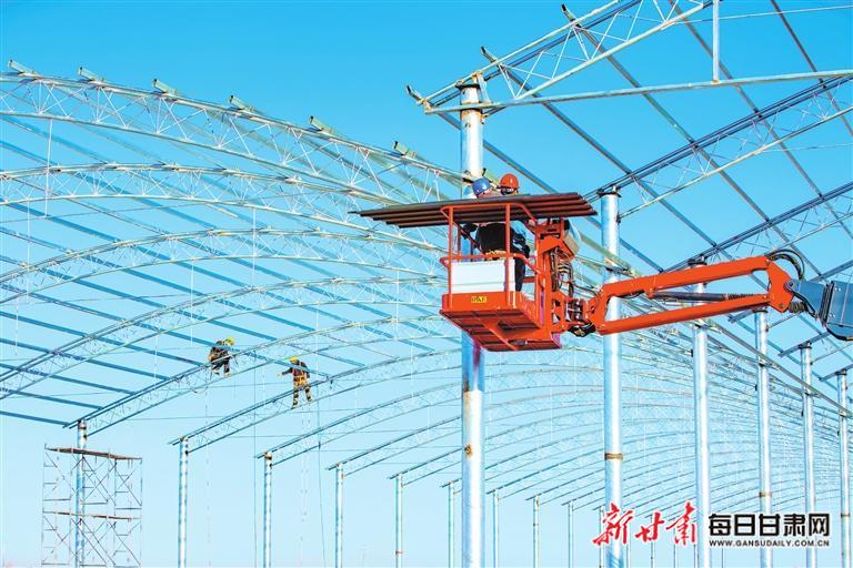4月6日,工人在张掖市甘州区党寨镇一处蔬菜种植基地搭建智能温室。新甘肃·甘肃日报通讯员 杨永伟