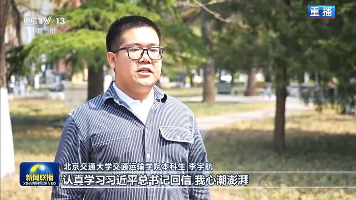 北京交通大学交通运输学院本科生 李宇航:认真学习习近平总书记回信我心潮澎湃。我们要以青春行动接续传承,赓续交大报国传统,深耕交通领域前沿研究,努力把青春汗水挥洒在祖国交通事业的第一线。