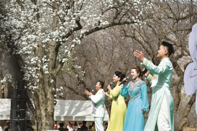 15时,阳光正好,梨园深处的西北民歌(花儿)歌会达到高潮。来自宁夏、内蒙古、陕西、青海、甘肃等地的30多位优秀民歌(花儿)歌手与传承人齐聚南长滩村,以花为约、以歌为媒,让歌声在百年梨树下回荡。