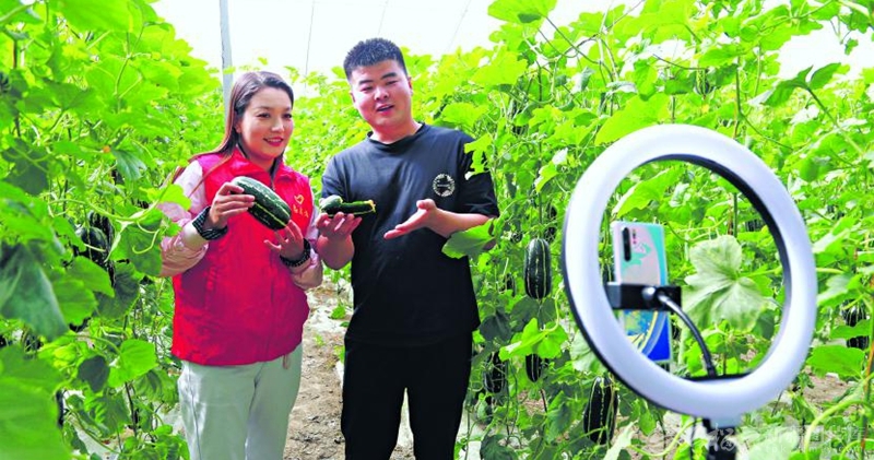 4月7日,在阿瓦提县塔木托格拉克镇吐格贝希村温室大棚里,年轻干部通过直播带货推广销售农产品,助力农民增收。 包良廷 摄