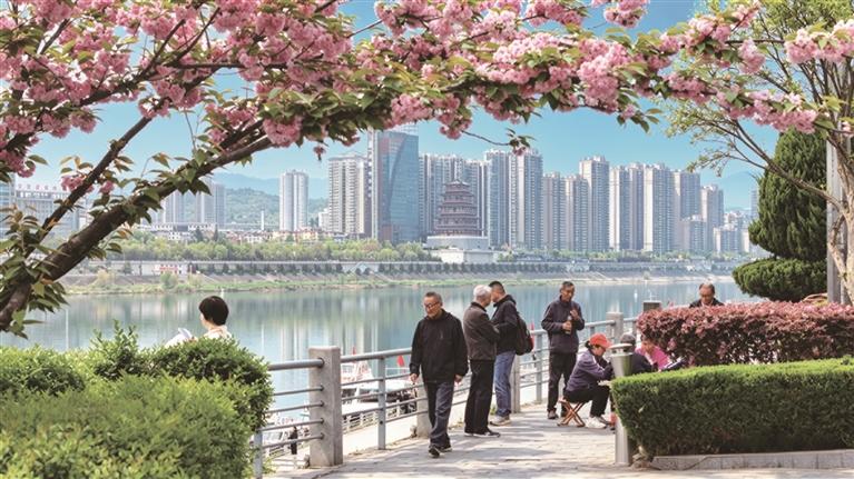 一江春水穿城过,满树繁花映江城。眼下,安康中心城区汉江边的樱花进入最佳观赏期,不仅美化了城市空间,还吸引了不少市民前来打卡拍照。图为市民在安康西城坊边的步道上散步(4月7日摄)。