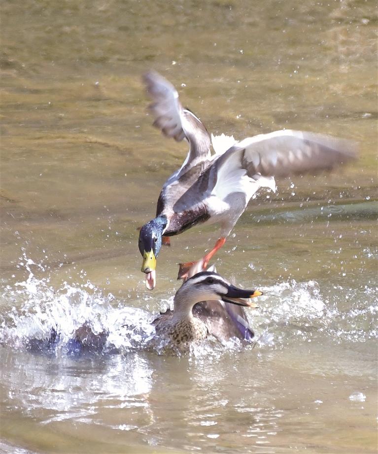 眼下正是候鸟迁徙的高峰期,延安陆续迎来众多夏候鸟及旅鸟。图为4月7日在延安市宝塔区枣园街道邓家沟村附近的西川河边拍摄的戏水中的绿头鸭与斑嘴鸭。 通讯员 王德荣 摄