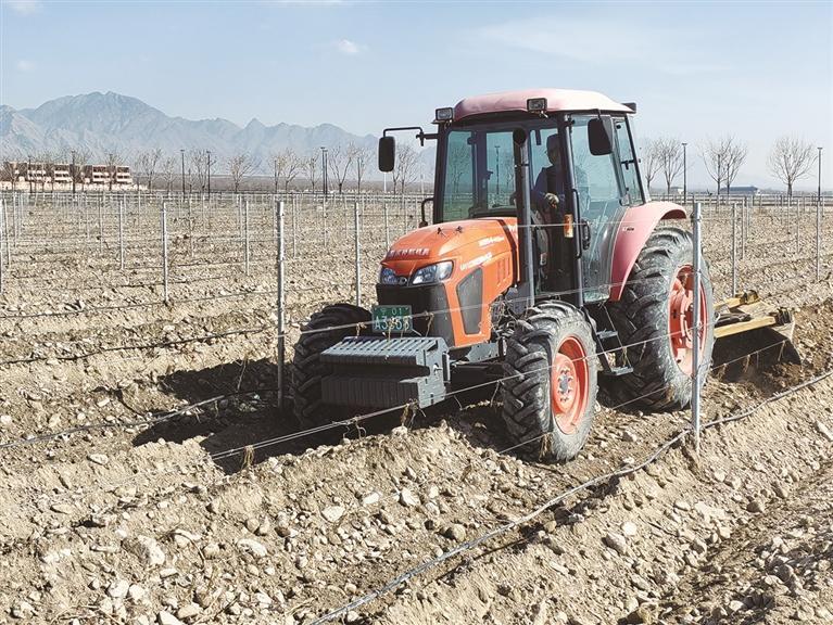 在银色高地酒庄种植基地,780亩葡萄园采用“机械+人工”的规范流程作业。拖拉机带动出土犁完成两遍刮土,工人再精细清土、引藤上架,既提升效率,又最大程度避免枝条损伤。