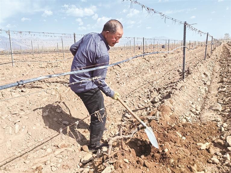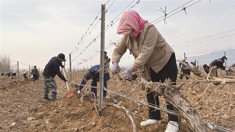 贺兰神(宁夏)国际葡萄酒庄有限公司万亩种植基地内,七八台机械穿梭其间,务工人员紧随其后开展人工出土、上架、绑藤。原隆村劳务经纪人张君宁忙着打电话调度工人:“最近外出务工人员多,人手有点紧张。”10年前,他从务工者转为经纪人,用工紧张时仍亲自下地干活。