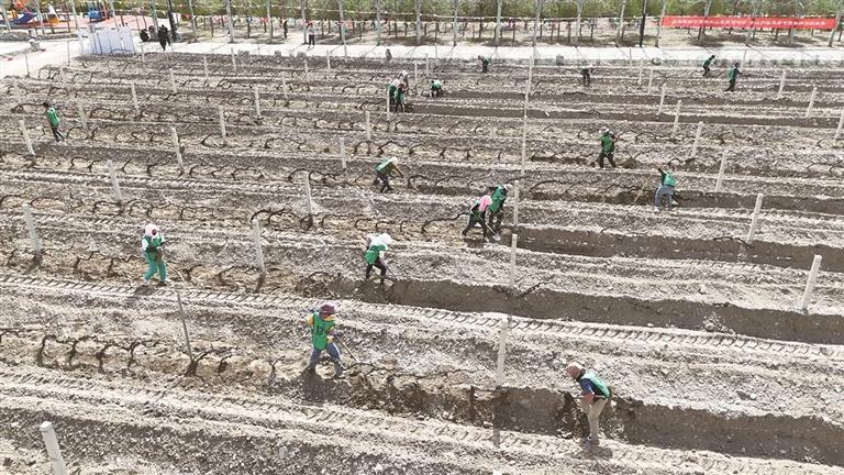 从银川市西夏区到永宁县、贺兰县;从成熟酒庄的连片园区,到科研导向的种质资源圃。机械轰鸣与人工劳作交织,铁锹翻飞与藤蔓舒展相映,一幅“春耕忙、展藤急、产业兴”的春日画卷,沿贺兰山下徐徐铺展。