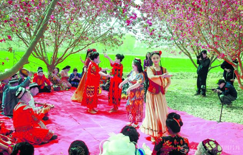 4月8日,民间艺人在阿瓦提县刀郎部落景区表演刀郎木卡姆。伴随欢快音乐,游客与艺人花间起舞,乐享美好时光。颜寿林 摄