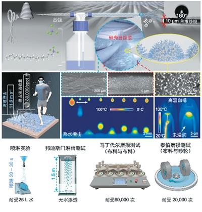“传统防水面料长期面临着两大难题,环保压力与耐磨性差。”中国科学院理化技术研究所研究员董智超说,当前织物主流防水技术大多依赖两类路径:一是含氟类物质(如PFOA、PFAS),二是纳米颗粒涂层。前者在日常使用过程中会对人类的健康以及生态环境造成潜在威胁,目前正在逐步禁用;而后者容易在摩擦、洗涤过程中脱落,导致性能迅速衰减。