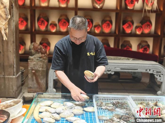 4月12日,福州文儒坊九号酒店管理有限公司董事长郭可文正在挑选漳港海蚌。中新网记者 叶秋云 摄
