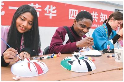 近日,江苏大学的外国留学生来到镇江市金山街道杨家门社区,体验京剧唱腔和表演、描画京剧脸谱,感受中国京剧的魅力。图为留学生在绘制京剧脸谱。
