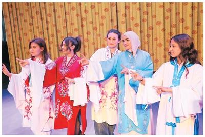 近日,山东省滨州市博兴县戏剧团和滨州职业技术大学联合开展“戏韵传情 中外相融”活动,邀请该校外国留学生走进剧团,近距离感受京剧的魅力。图为留学生在专业京剧演员的指导下学习京剧表演动作。