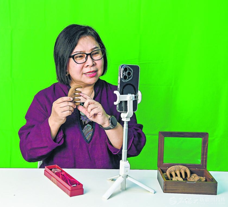 4月8日,张馨文在直播中给粉丝介绍用香材研发制作的梳子。