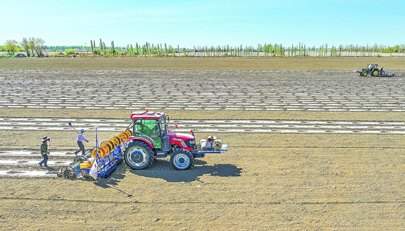 4月10日,大型播种机在尉犁县古勒巴格乡巴西买里村的高标准棉田里播种(无人机照片)。近日,在尉犁县古勒巴格乡的高标准棉田里,种植户利用晴好天气有条不紊开展播种作业。今年尉犁县采用“干播湿出”“精量播种”等多种播种技术,计划种植棉花100万亩。新华社发(汪志鹏 摄)