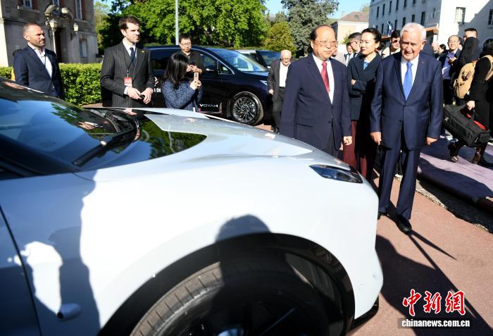 当地时间4月14日,中欧汽车新生态合作交流会在巴黎举行。图为法国前总理拉法兰在交流会现场参观展示的“武汉造”新能源汽车。 中新社记者 李洋 摄
