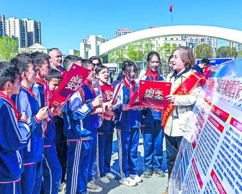 4月13日,乌鲁木齐市天山区大湾街道党员志愿者在乌鲁木齐天山公园向学生和群众普及国家安全知识,营造“国家安全、人人有责”的浓厚氛围。 孙振嵩 摄