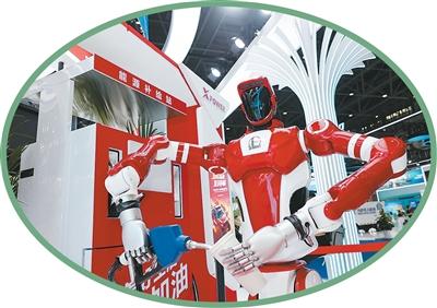 在第六届消博会科技消费展区,中国石化展台展示机器人加油。