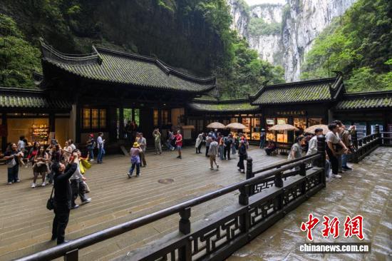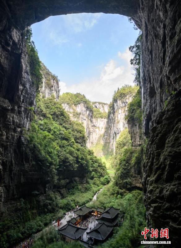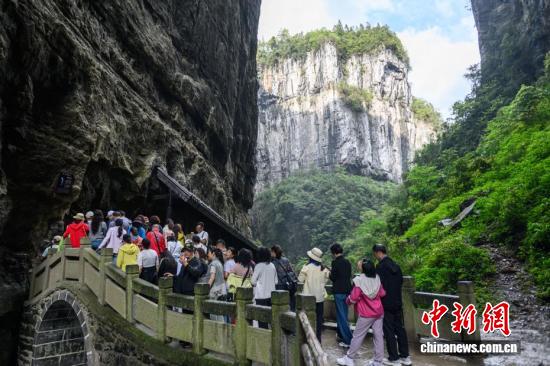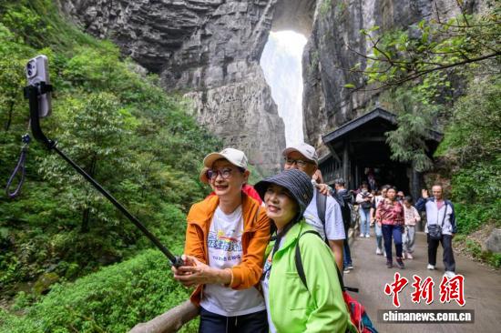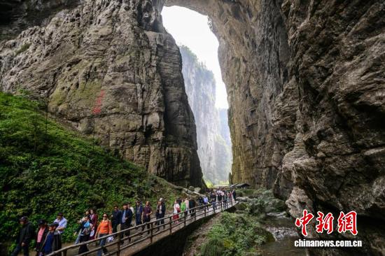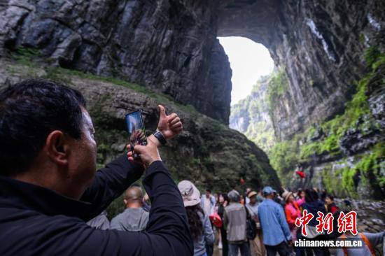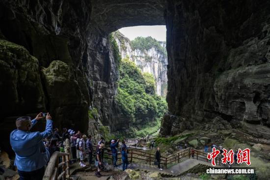 4月16日,游客在重庆武隆天生三桥景区游览。世界自然遗产重庆武隆天生三桥由天龙桥、青龙桥、黑龙桥三座天然石拱桥组成,是典型的喀斯特地貌景观。近年来,当地依托独特的自然资源优势,不断完善旅游基础设施、提升服务品质,吸引全球各地游客前来观光游览。中新社记者 何蓬磊 摄